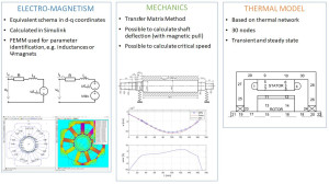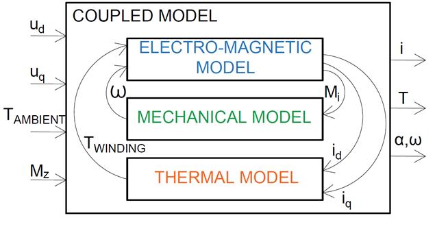 Virtuální dvojče pohonu se skládá ze tří hlavních součástí – elektromagnetismus, teplo a mechanika, které jsou propojeny a vzájemně se ovlivňují. Mechanické zatížení motoru se tedy projeví na jeho teplotě. Tepelný model má zároveň vliv na model elektromagnetický, jelikož s rostoucí teplotou roste elektrický odpor vinutí. Potenciální výhodou tohoto modelu je přesnější výpočet teplot motoru v závislosti na jeho zatížení a rovněž výpočet teplot na místech, která nejsou dostupná – například magnety na rotoru.